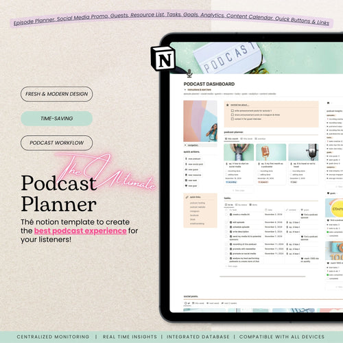 Transform your podcasting workflow with this comprehensive Notion template, designed to help you plan episodes, manage guests, track content calendars, and monitor performance metrics—all in one centralized hub. Whether you're launching your first show or scaling an existing series, this template brings clarity and efficiency to every stage of your podcast journey.